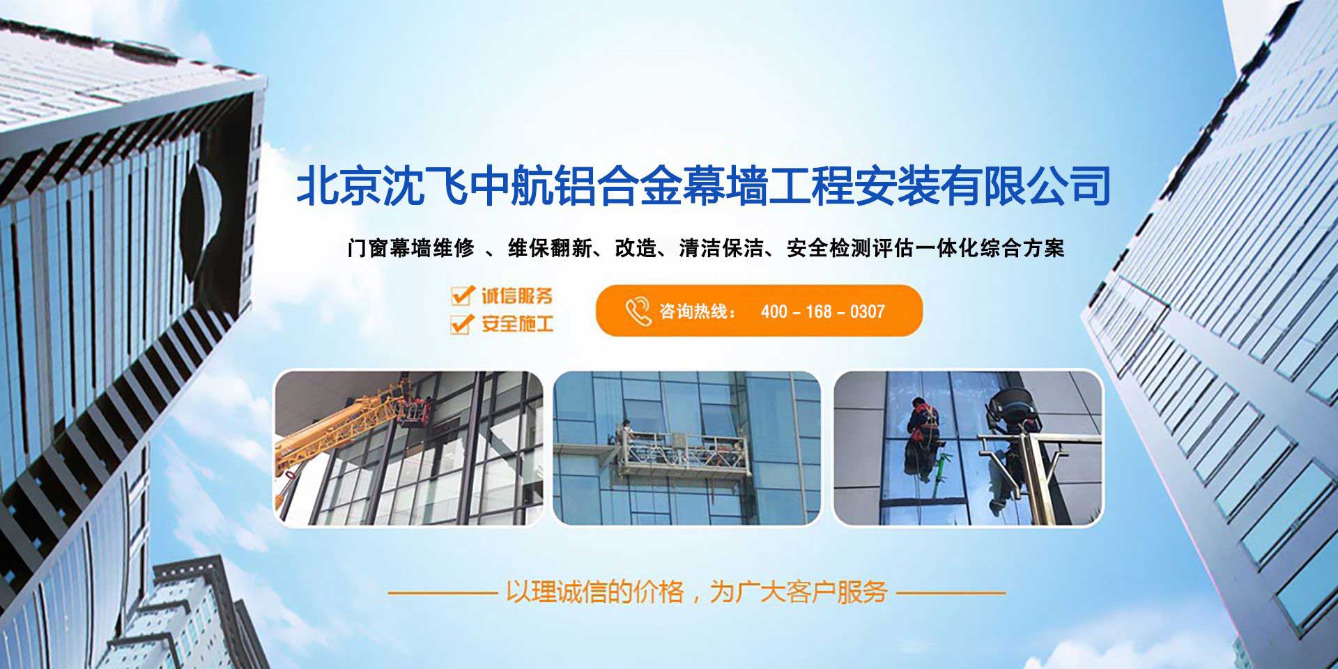 北京沈飛中航鋁合金幕墻工程安裝有限公司成立于2003年,注冊資金500萬,公司主要從事建筑門窗幕墻的設計、制造加工、安裝、售后為一體的專業化服務,公司成立以來為社會各界提供了優質的服務。 為了滿足新老客戶及社會各界的需求,2005年公司在售后服務部的基礎上成立了專業的門窗幕墻維修、維保、保潔于一體的專業化公司,我公司以專心、專注、專業的服務宗旨,以客戶為中心的服務理念,以公司多年的設計、制造加工、安裝積累的經驗為依托,為社會各界提供了優質的門窗幕墻維修維保服務。 與您一次的合作可能將成為終生朋友,公司領導及全體員工熱忱的期待與社會各界取得更為廣泛的合作,愿為廣大的客戶提供一流的服務,為美化城市做出更大的貢獻。